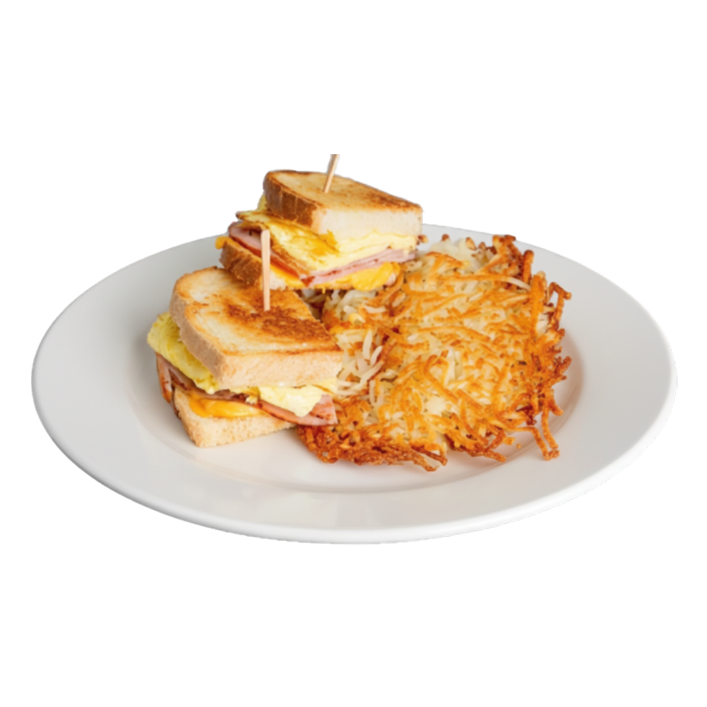 2 omelette-style eggs, grilled sliced ham, swiss & american cheese in grilled sourdough bread. Served with hashbrowns.