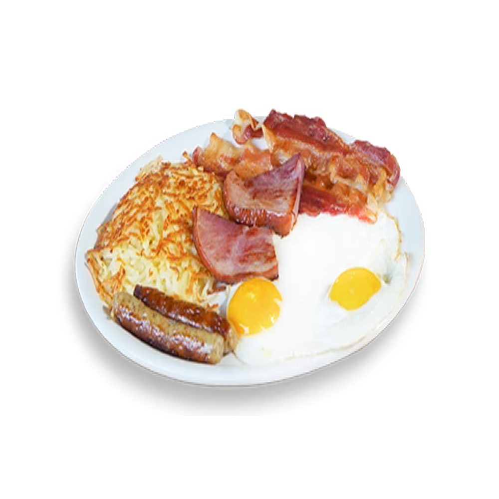 2 eggs any style, hashbrowns, 2 pork bacon strips, 2 pork sausages, 2 ham strips and 2 buttermilk pancakes.