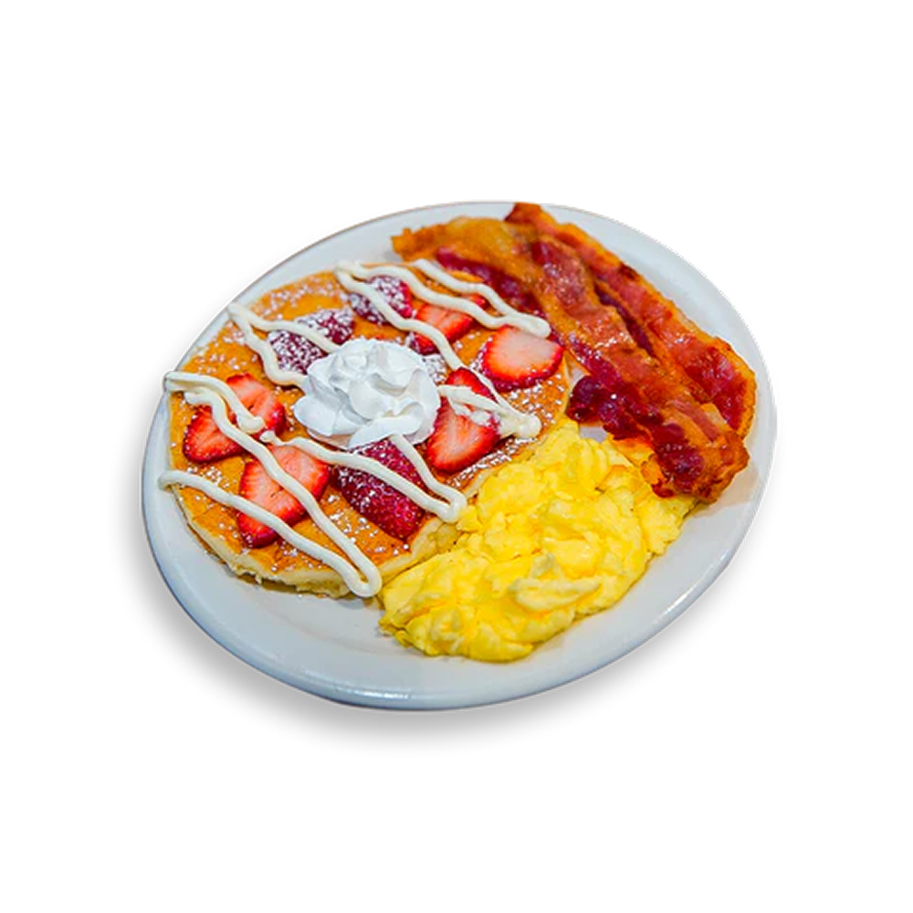 1 Pancake with fresh strawberry slices & our homemade sweet cheesecake. Topped with powdered sugar, fresh whipped cream & a mint leaf. Includes 1 scrambled egg & 2 bacon strips.