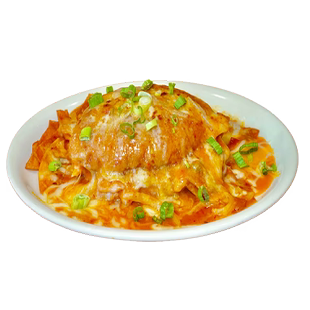 Freshly fried tortilla strips sauteed in your one choice of our famous chilaquiles sauce: red spicy, red mild, green spicy or green not spicy. With caramelized onions, slow cocked & mildly spicy beans, a blend of jack and cheddar cheese on a grilled telera bread. Garnished with chives.