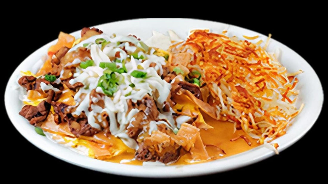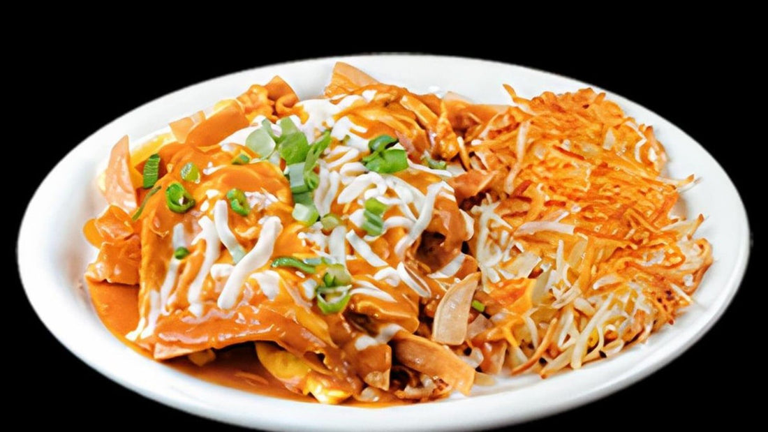 2 scrambled eggs covered with freshly fried tortilla strips, marinated steak, your one choice of our famous chilaquiles sauce: red spicy, red mild, green spicy or green not spicy. With a blend of jack and cheddar cheese with chives. Served with hashbrowns.