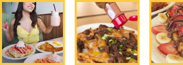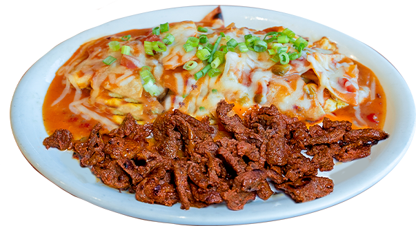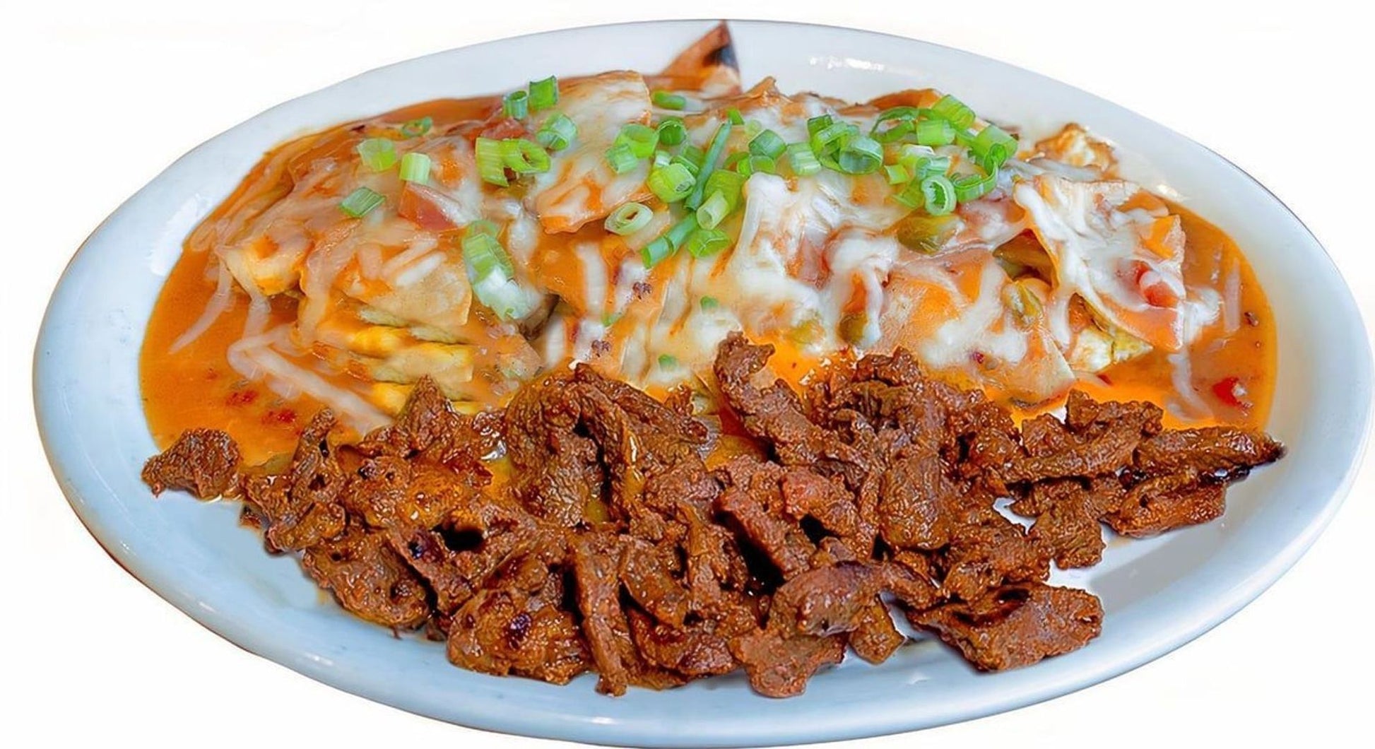 A 3 egg omelette with freshly fried tortilla chips sautéed in your one choice of our famous chilaquiles sauce: red spicy, red mild, green spicy or green not spicy. With caramelized onions, a blend of jack and cheddar cheese with chives. Served with a side of marinated steak.