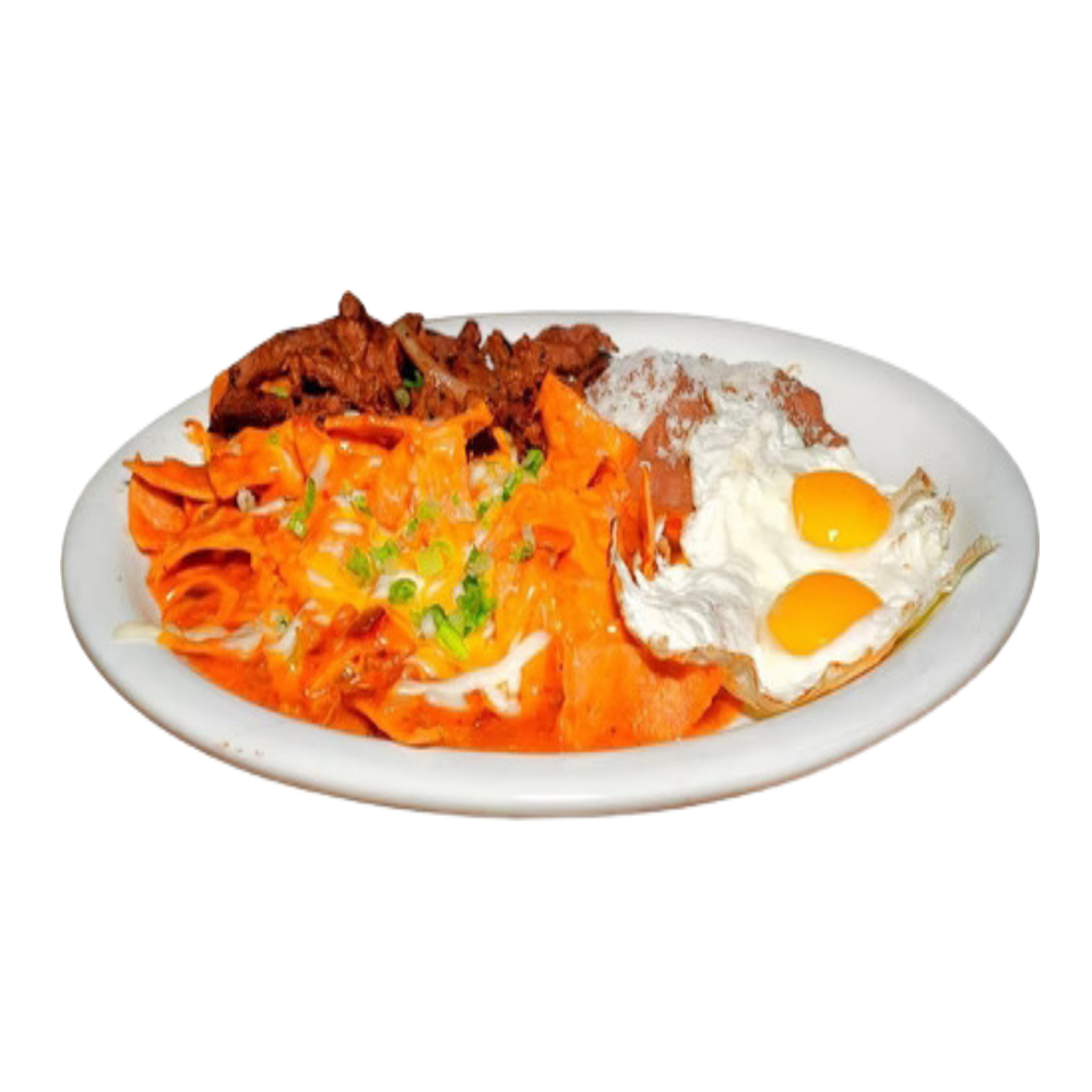 Marinated steak with sliced onions & freshly fried tortilla chips sauteéd in your one choice of our famous chilaquiles sauce: red spicy, red mild, green spicy or green not spicy. With a blend of jack and cheddar cheese with chives. Served with 2 eggs cooked any style, slow cooked & mildly spicy beans finished with cotija cheese.