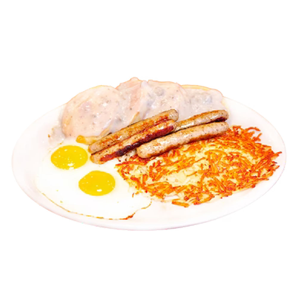 Fluffy biscuits topped with creamy sausage gravy, served as a side.