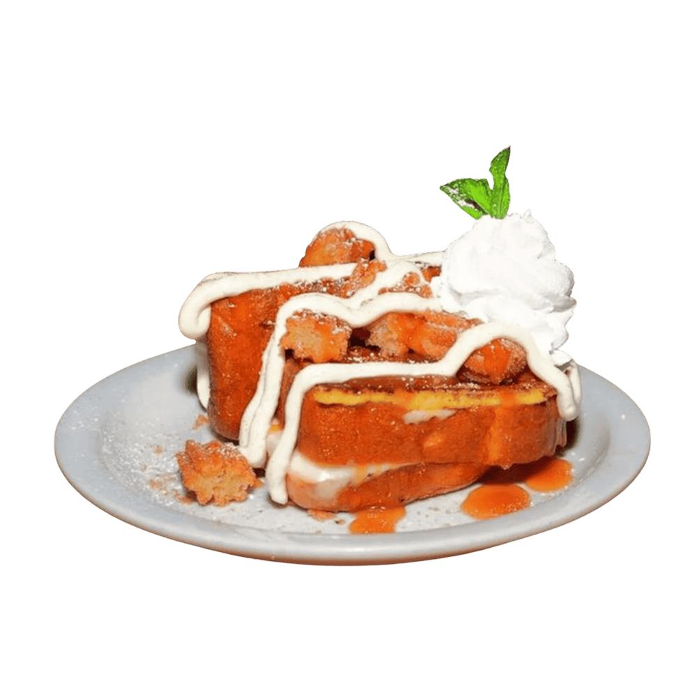 2 slices of Brioche French Toast stuffed with our homemade sweet cream cheese and caramel drizzle. Topped with cinnamon sugar, powdered sugar, fresh whipped cream & a mint leaf.