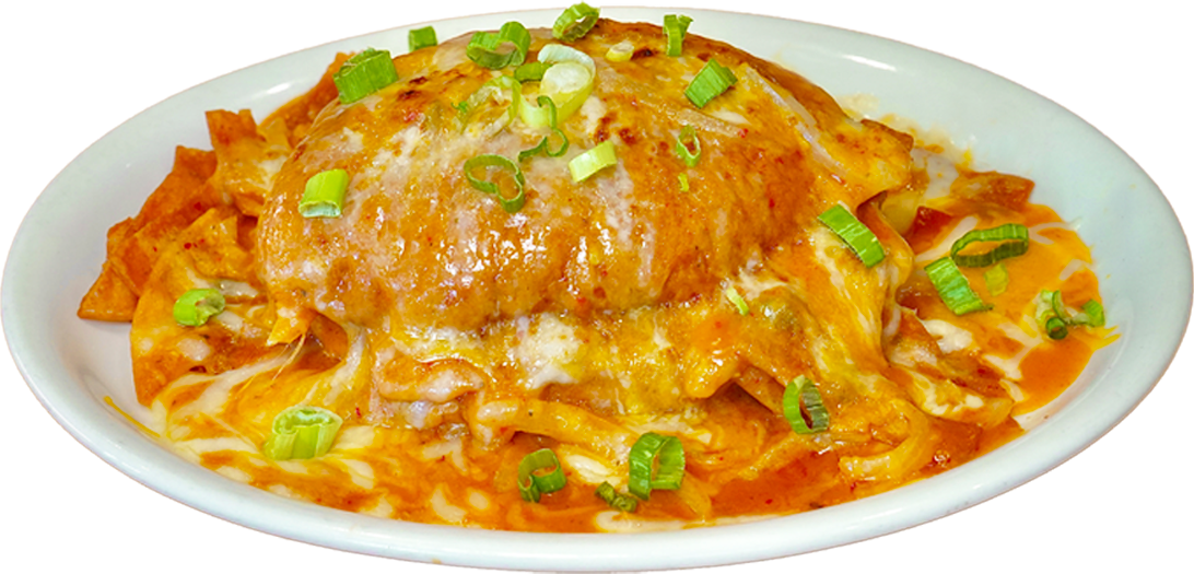 Freshly fried tortilla strips sauteed in your one choice of our famous chilaquiles sauce: red spicy, red mild, green spicy or green not spicy. With caramelized onions, slow cocked & mildly spicy beans, a blend of jack and cheddar cheese on a grilled telera bread. Garnished with chives.