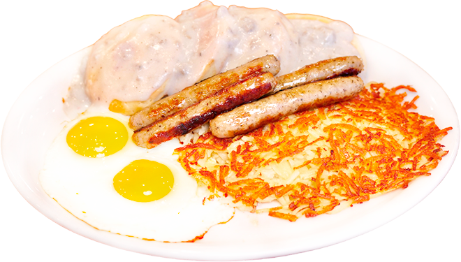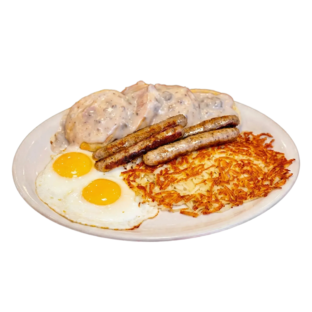 2 biscuits cut in a half with pork sausage gravy, hashbrowns, 2 eggs & 4 pork sausages.