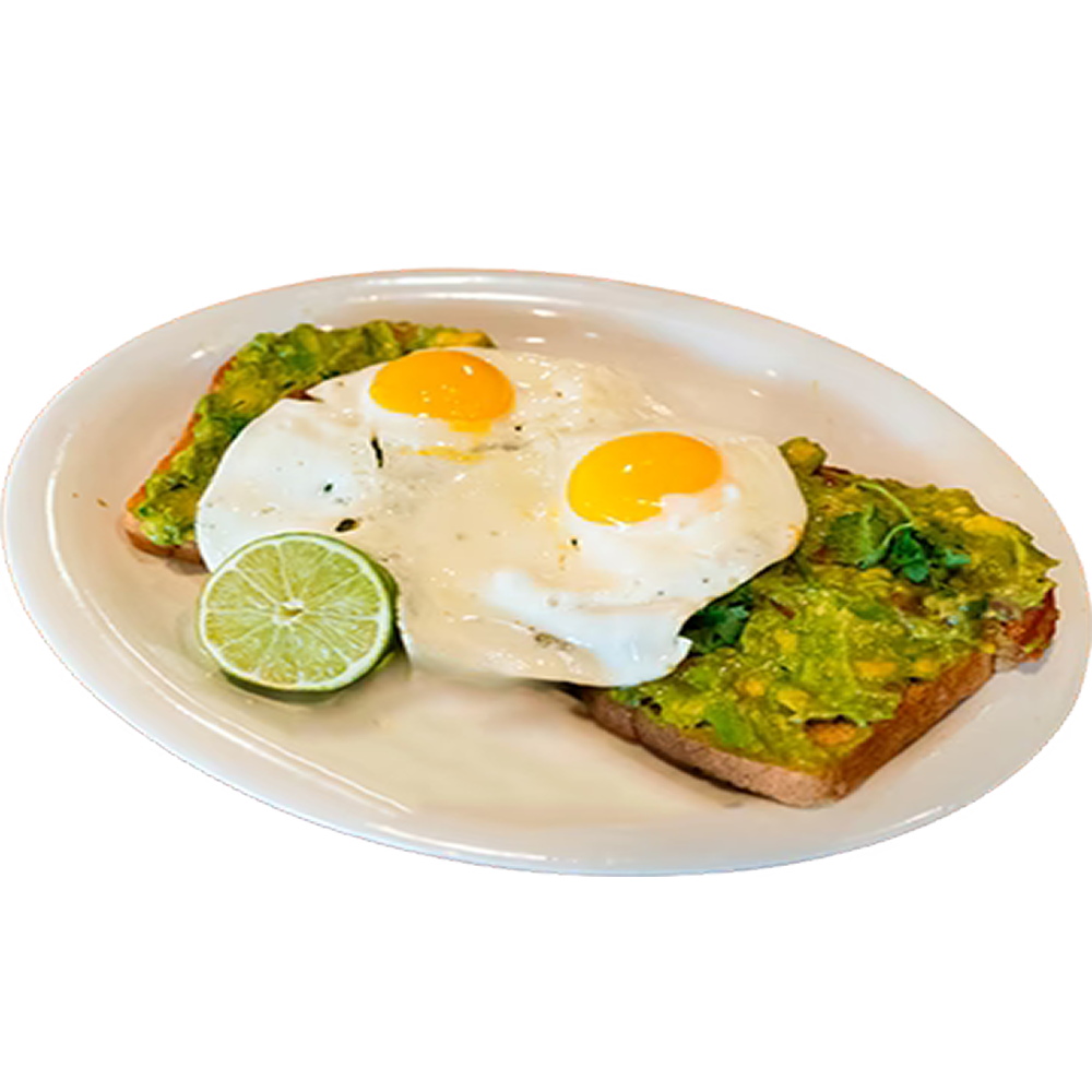 2 Slices of whole wheat toast smothered with fresh mildly spicy guacamole. Topped with cilantro leaves & 2 eggs any style.