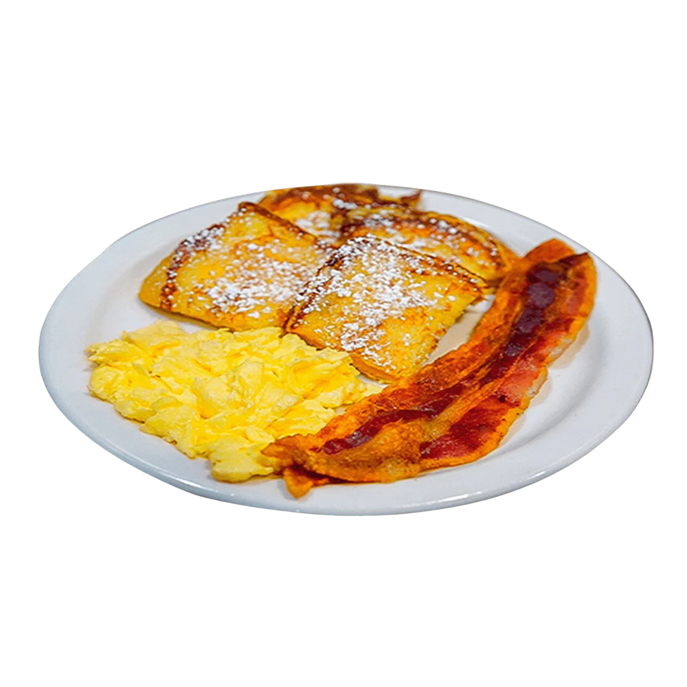 1 egg, 1 brioche french toast, 2 pork bacon strips.