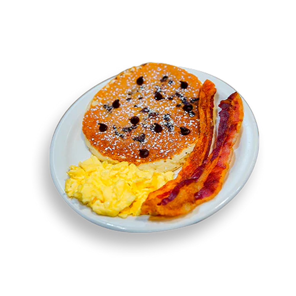1 Original pancake with baked in chocolate chips. Topped with more chocolate chips, powdered sugar, fresh whipped cream & a mint leaf. Includes 1 scrambled eggs & 2 bacon strips.