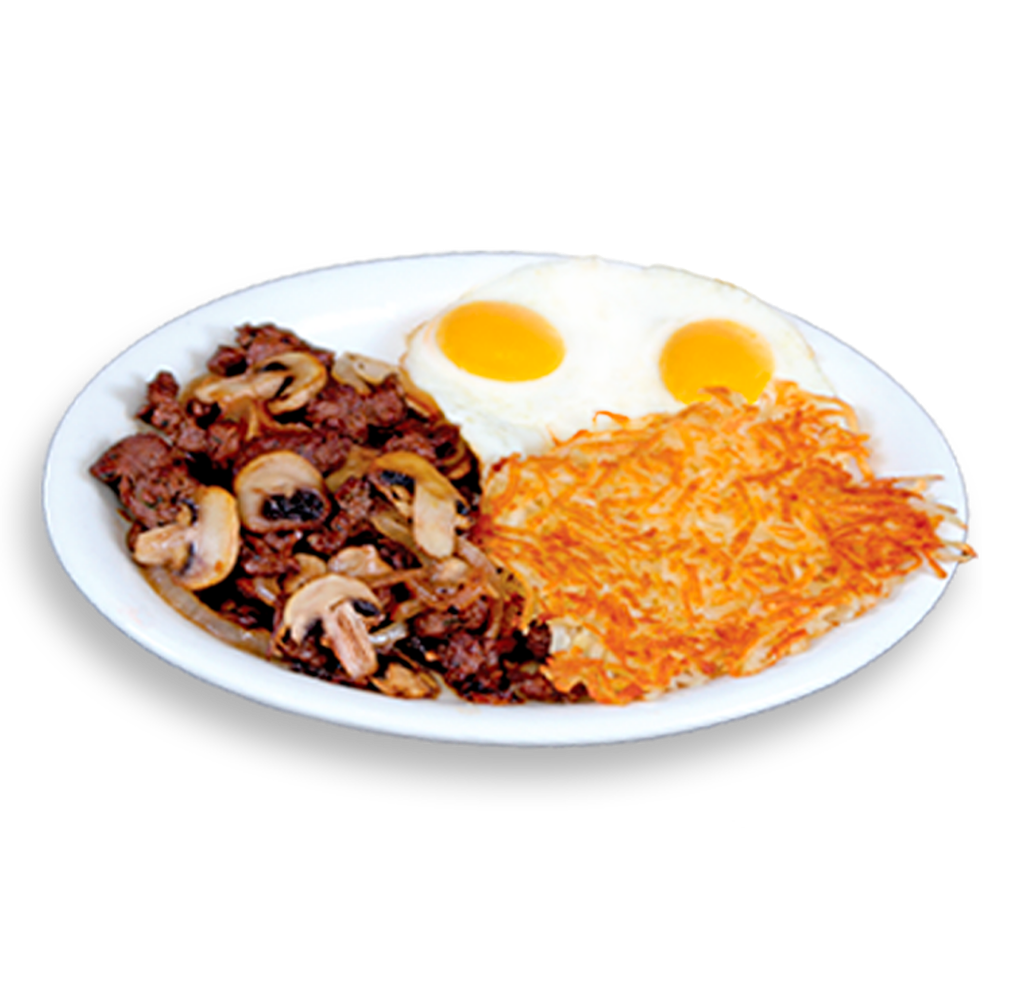 Savory Sirloin Steak strips with grilled onions. mushrooms, hashbrowns, 2 eggs & 2 buttermilk pancakes.