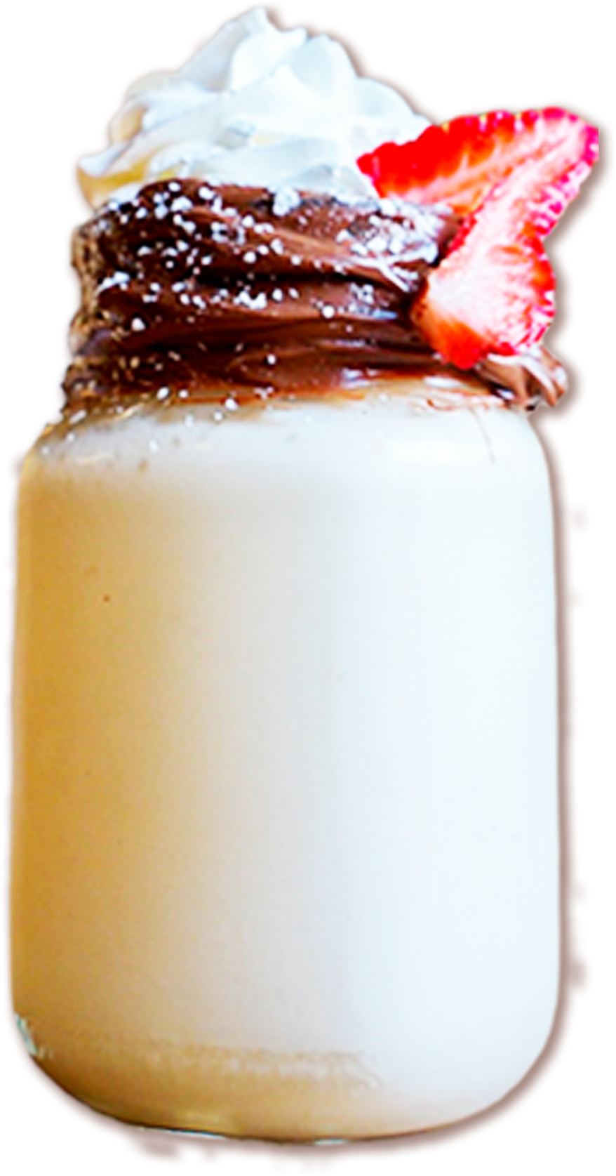 Creamy blend of Nutella and banana topped with whipped cream, chocolate drizzle, and a fresh strawberry slice.