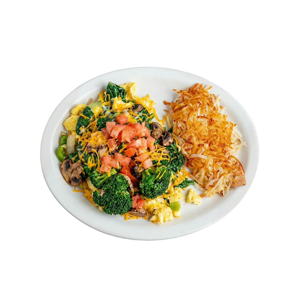 2 scrambled eggs mixed with green bell pepper & onions. Topped with spinach, grilled mushrooms, broccoli, a blend of jack and cheddar cheese & diced tomatoes. Served with hashbrowns.