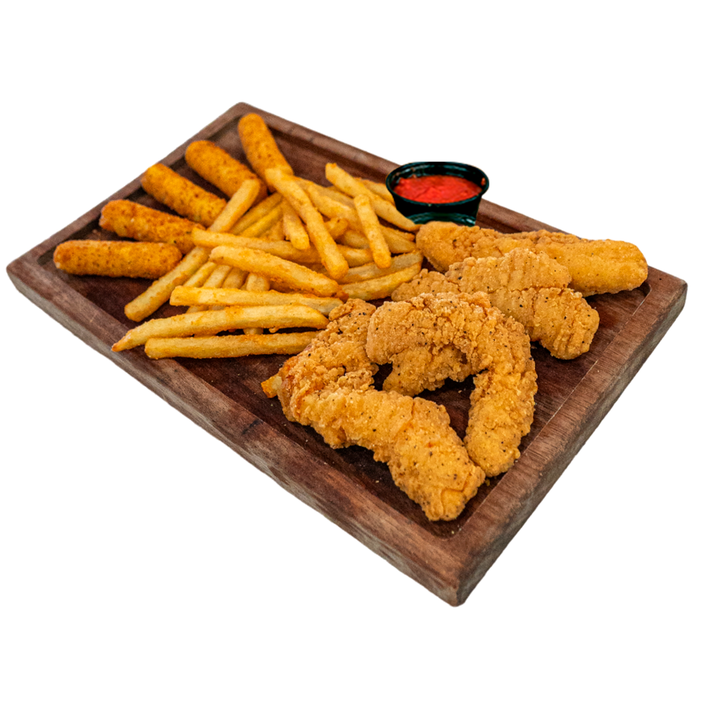 5 mozzarella cheese sticks, french fries, 4 chicken strips and marinara sauce.